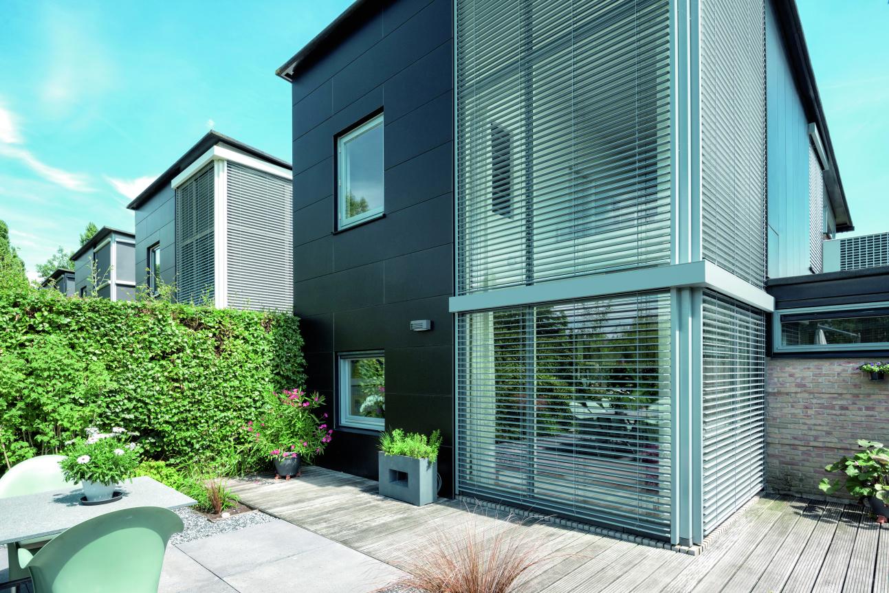 Raffstorenlamellen wirken herabgefahren sehr filigran und verleihen der Fassade eine pure und flache Optik.