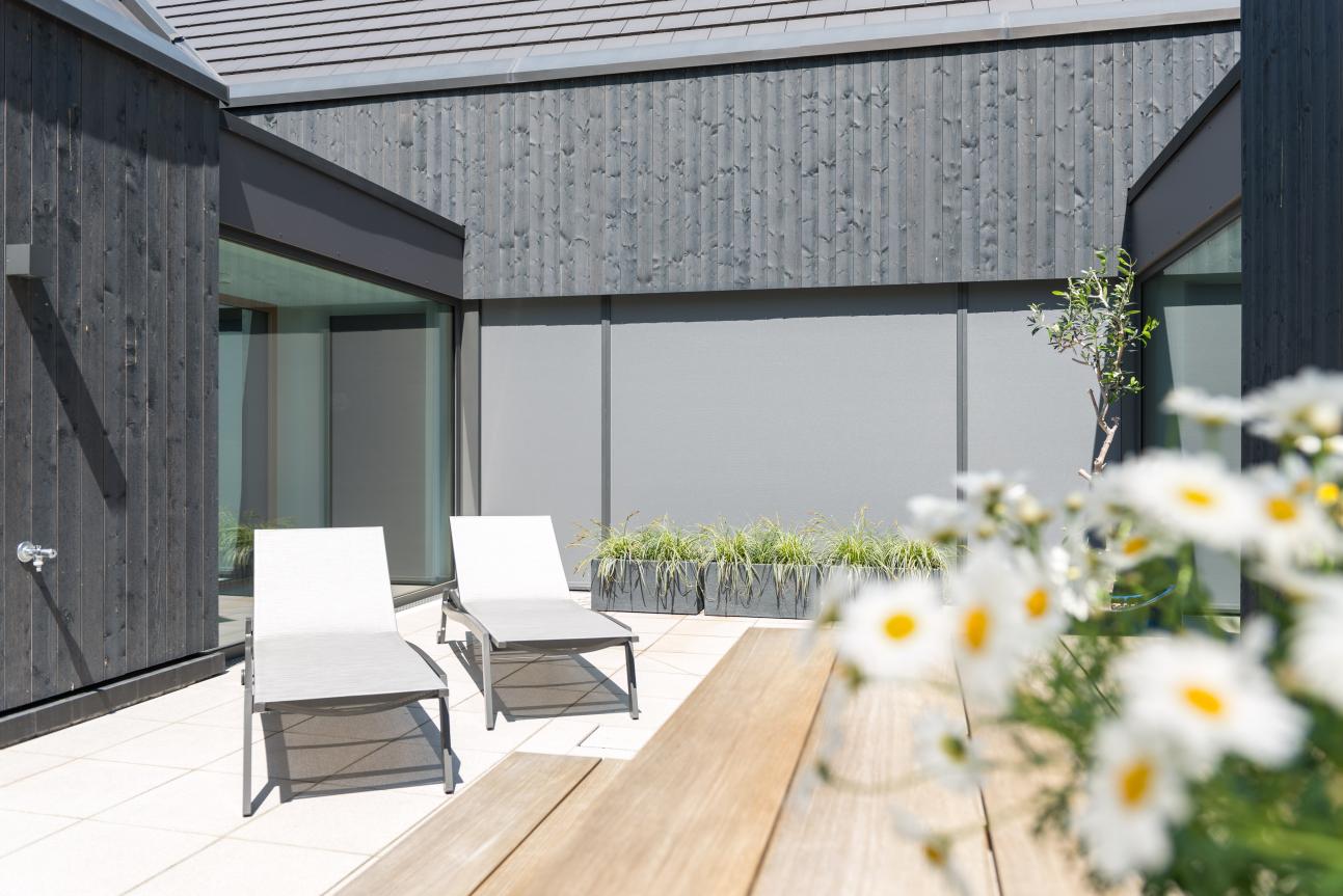 Für Panorama-Verglasungen eignen sich vor allem sogenannte Zipscreens. Der motorangetriebene Behang, der auch bei großen Flächen nicht geteilt werden muss, sorgt für eine ästhetische und zuverlässige Beschattung.
